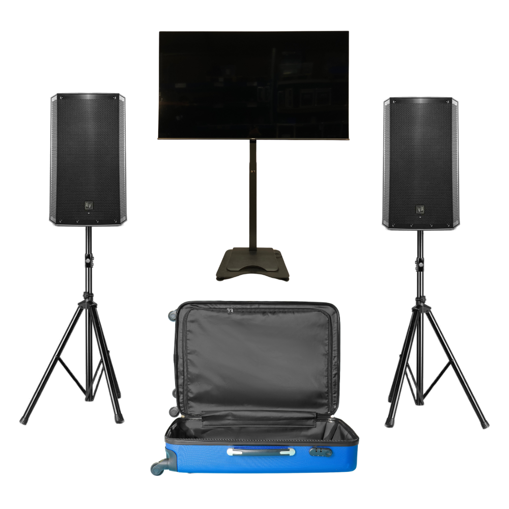 Komplet i en handy kuffert. Sæt til strøm og dine højtalere.
